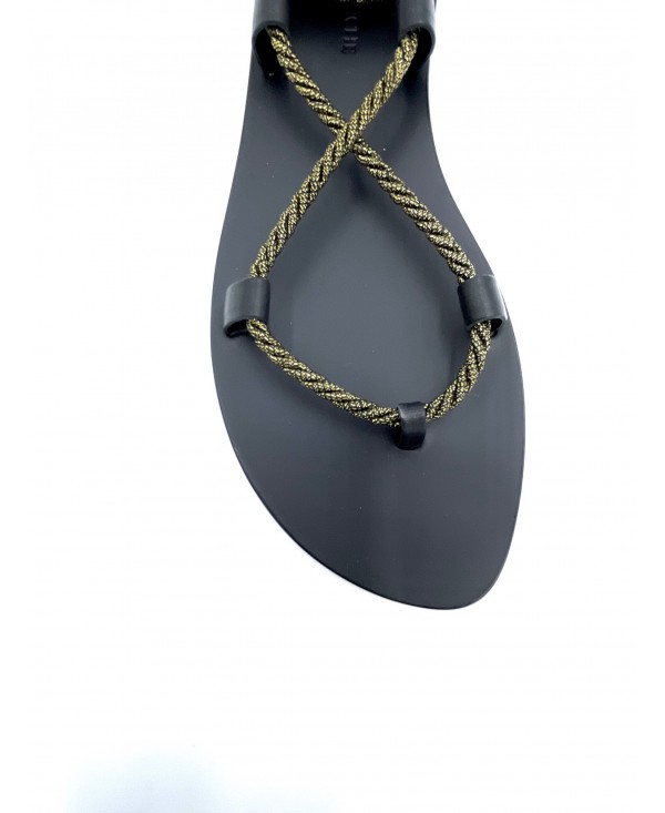 Black leather heeled gladiator sandals with bronze lurex rope