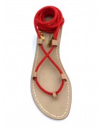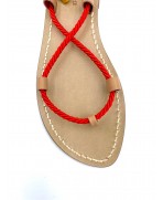 The White Tarah Blanche gladiator sandals are an elegant interpretation of the classic gladiator model. With a leather sole and a wooden heel in natural colors made by hand in Italy. The sandal is adorned with a cord satin red color, finished with a gold metal toe cap that attaches with leather loops to weave around the ankle to bring a refined touch.
