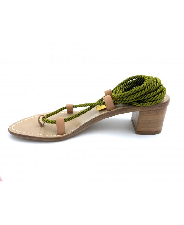 Heeled gladiator sandals natural leather with khaki satin rope