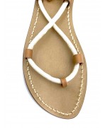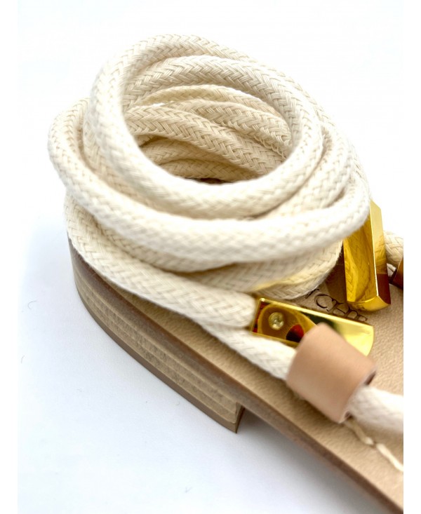 The White Tarah Blanche gladiator sandals are an elegant interpretation of the classic gladiator model. With a leather sole and a wooden heel in natural colors made by hand in Italy. The sandal is adorned with a raw cotton rope, natural color, finished with a gold metal toe cap that attaches with leather loops to weave around the ankle to bring a refined touch.