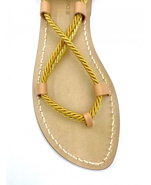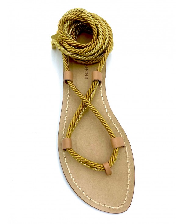 Sandales Gladiateur à talons en cuir naturel à double corde lurex or et satin vieil or