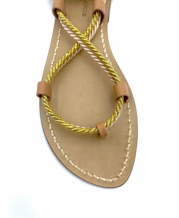 Les sandales gladiateur Tarah Blanche sont une interprétation élégante du modèle gladiateur classique. Avec une semelle de cuir et un talon de bois couleur naturelle réalisés de façon artisanale en Italie. La sandale est ornée d'une double corde satin de couleur nude et lurex couleur or, terminée par un embout métallique doré qui s’attache par des passants de cuir , à entrelacer autour de la cheville pour apporter une touche raffinée.