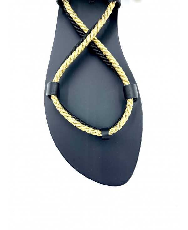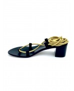 Sandales Gladiateur à talons en cuir noir à double corde satin noir et lurex or