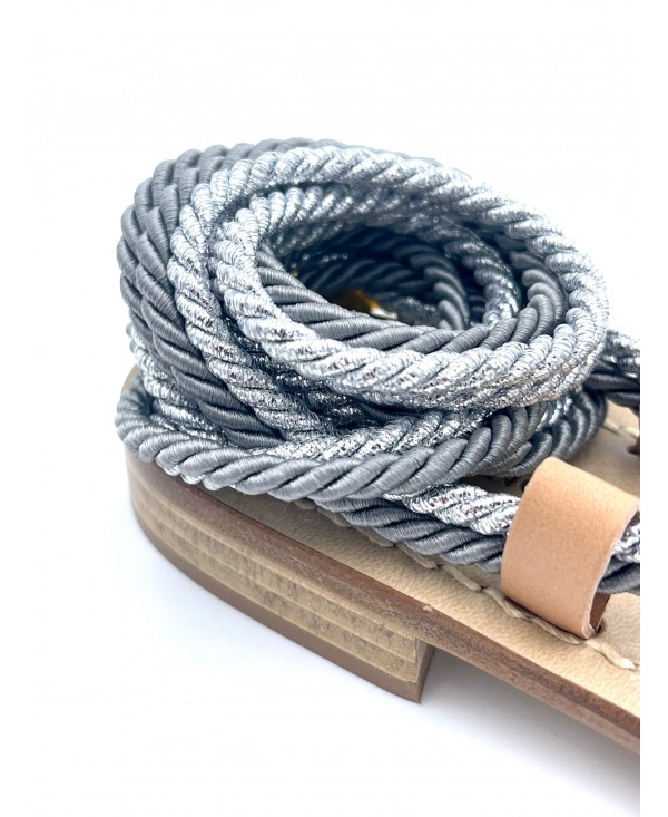 Sandales Gladiateur en cuir naturel à double corde lurex argent et satin gris perle
